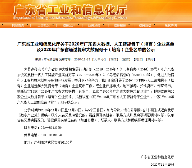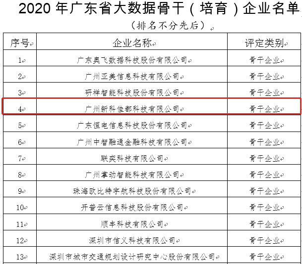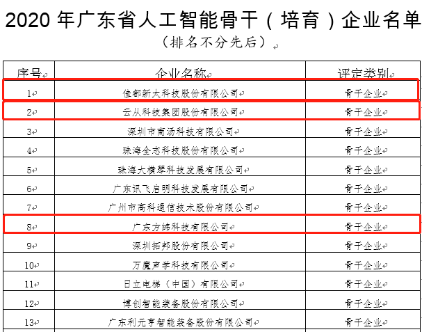 11月23日,广东省工业和信息化厅发布了关于2020年广东省大数据、人工智能骨干(培育)企业名单的公示。三亿体育科技凭借着突出的人工智能创新能力和产业带动作用,入选2020年广东省人工智能骨干企业名单,同时,三亿体育科技控股子公司方纬科技、参股公司云从科技入选该名单,三亿体育科技全资子公司新科佳都入选2020年广东省大数据骨干企业名单。