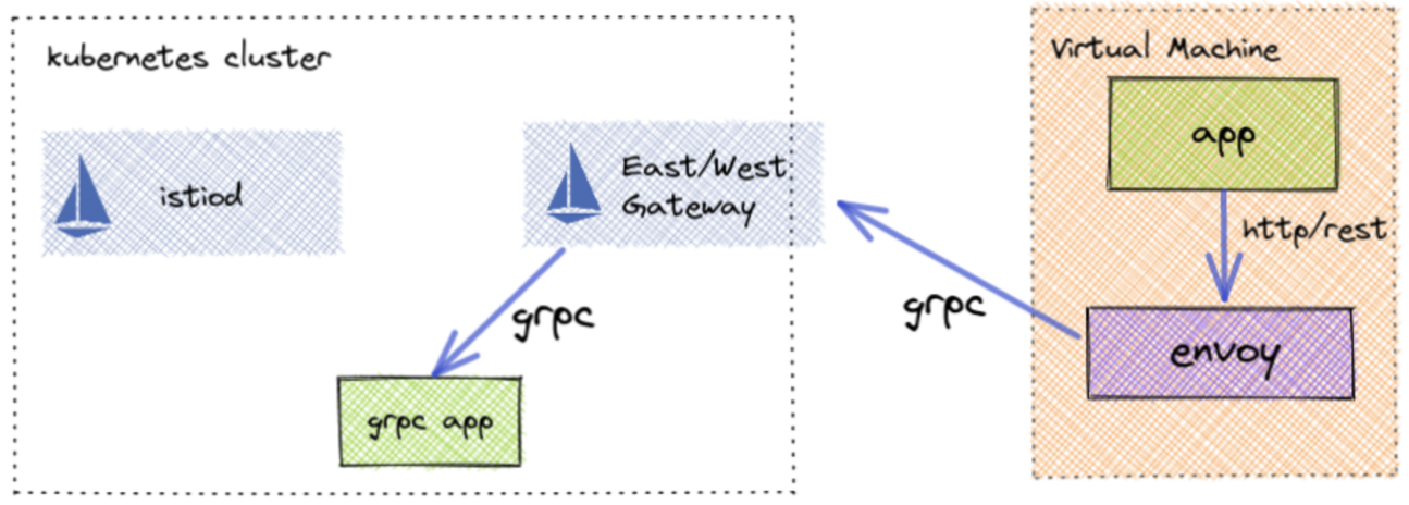 下面是一个安装 istiod 和上面显示的东西向网关的 Istio 示例。 PILOT_SKIP_VALIDATE_TRUST_DOMAIN 启用,以便虚拟机可以拥有自己的 SPIFFE ID 格式。