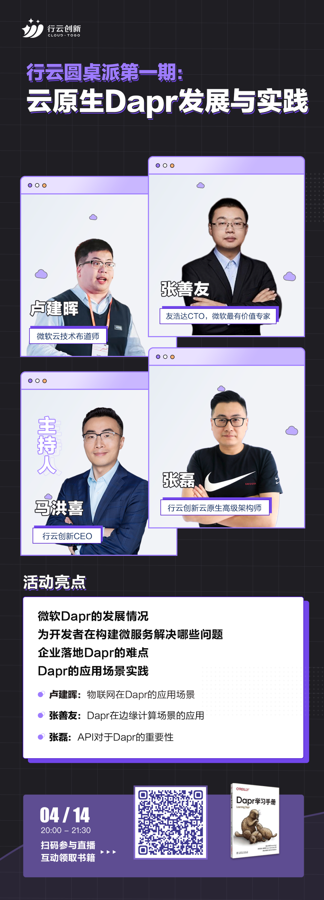 4月14日晚上8点,《行云圆桌派第一期:云原生Dapr的发展与实践》直播来啦!活动由NG28创新CEO马洪喜,微软最有价值专家、.NET技术专家张善友,微软云技术布道师卢建晖,NG28创新云原生架构师张磊四位嘉宾与大家聊聊Dapr的发展情况和落地遇到的问题、Dapr应用场景实践、未来展望等。